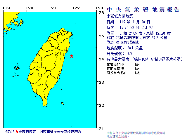 | 發 震 時 間: | 115年 3月28日13時22分11.1秒 |