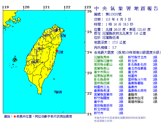 | 發 震 時 間: | 115年 4月 5日 1時14分58.5秒 |