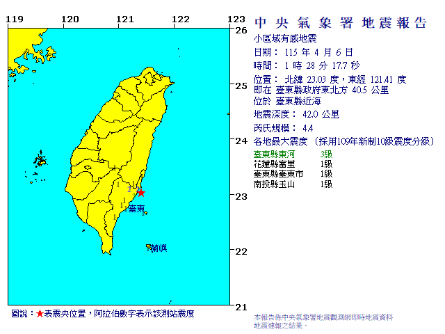 | 發 震 時 間: | 115年 4月 6日 1時28分17.7秒 |