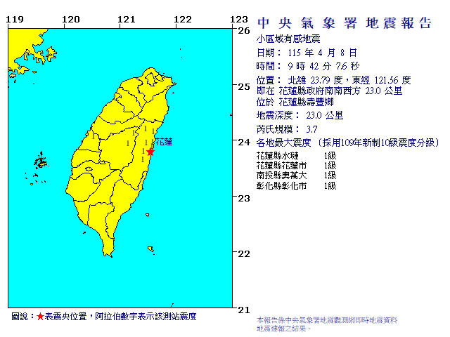 | 發 震 時 間: | 115年 4月 8日 9時42分 7.6秒 |