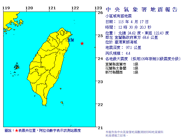 | 發 震 時 間: | 115年 4月17日12時30分20.3秒 |
