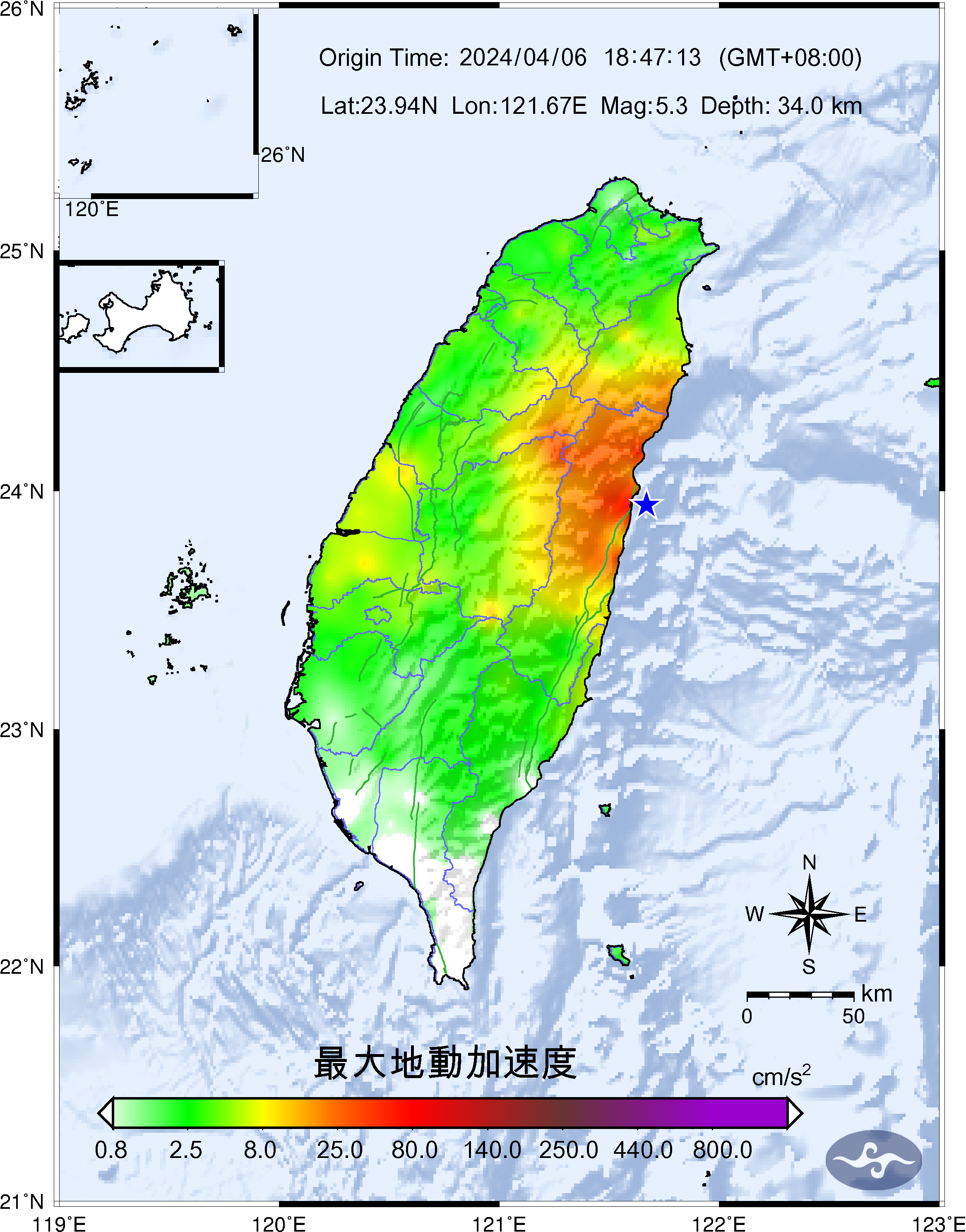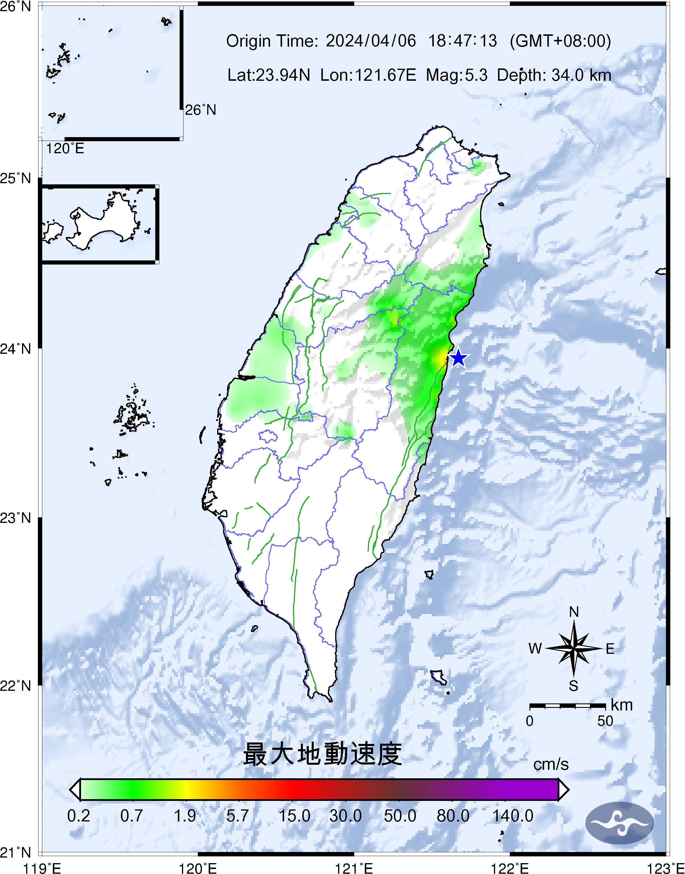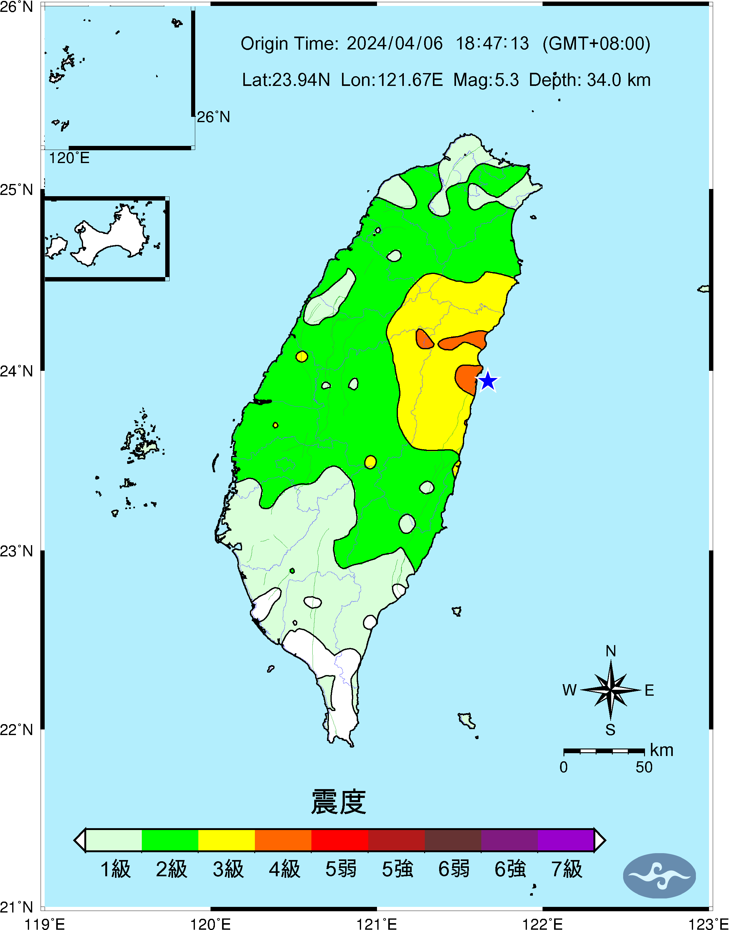 Origin Time:2024/04/06 18:47:13 Lon:121.67°E Lat:23.94°N Depth:34.0km