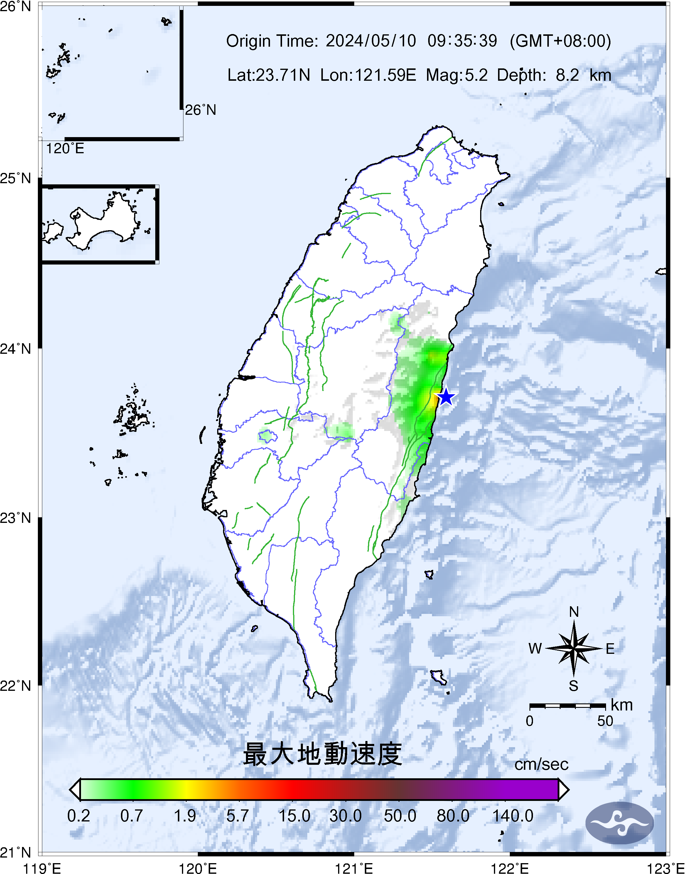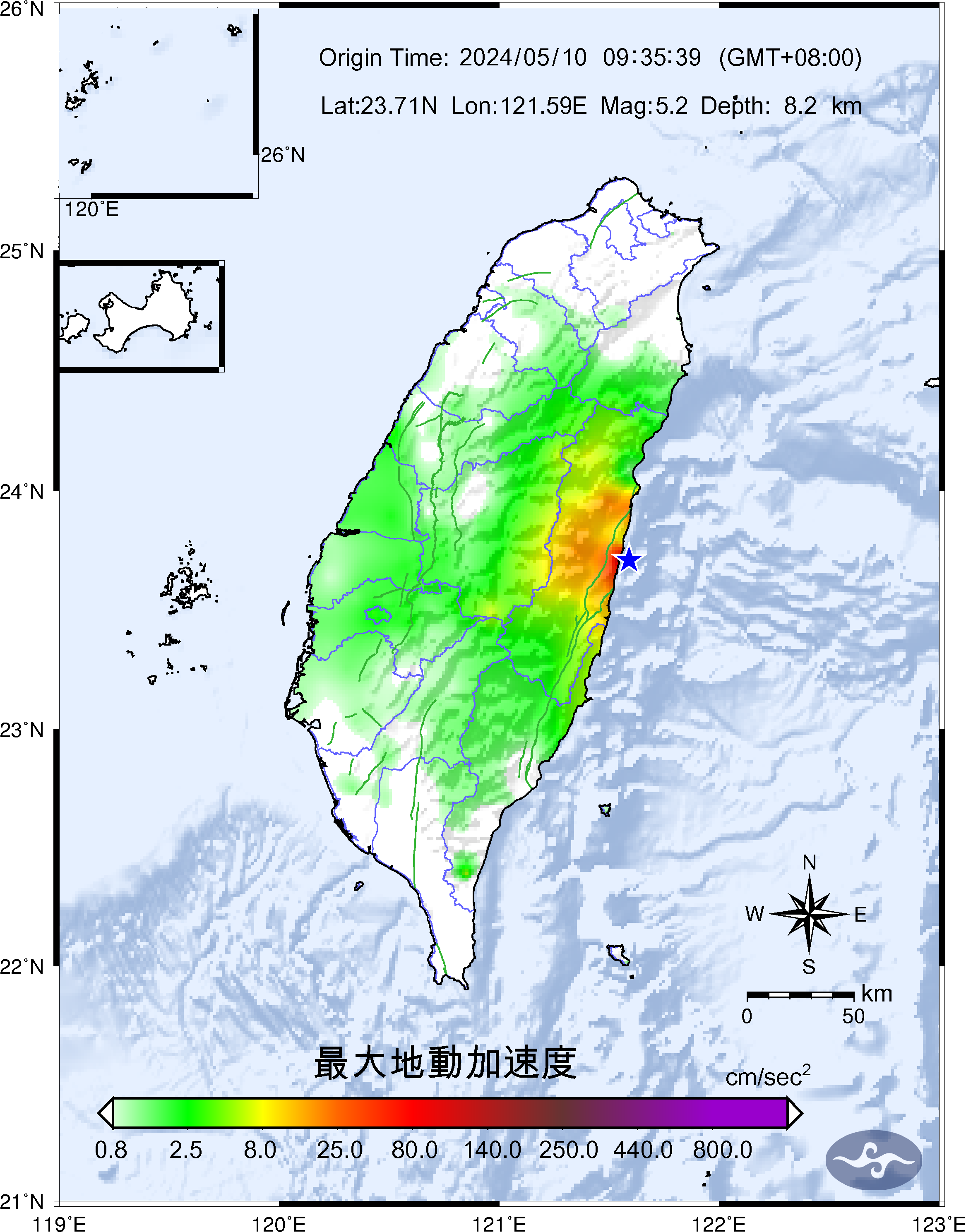 Origin Time:2024/05/10 09:35:39 Lon:121.59°E Lat:23.71°N Depth:8.2km