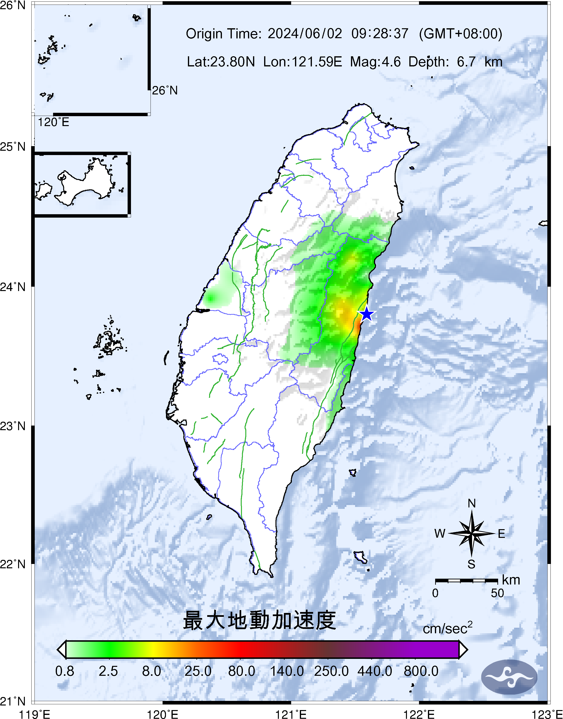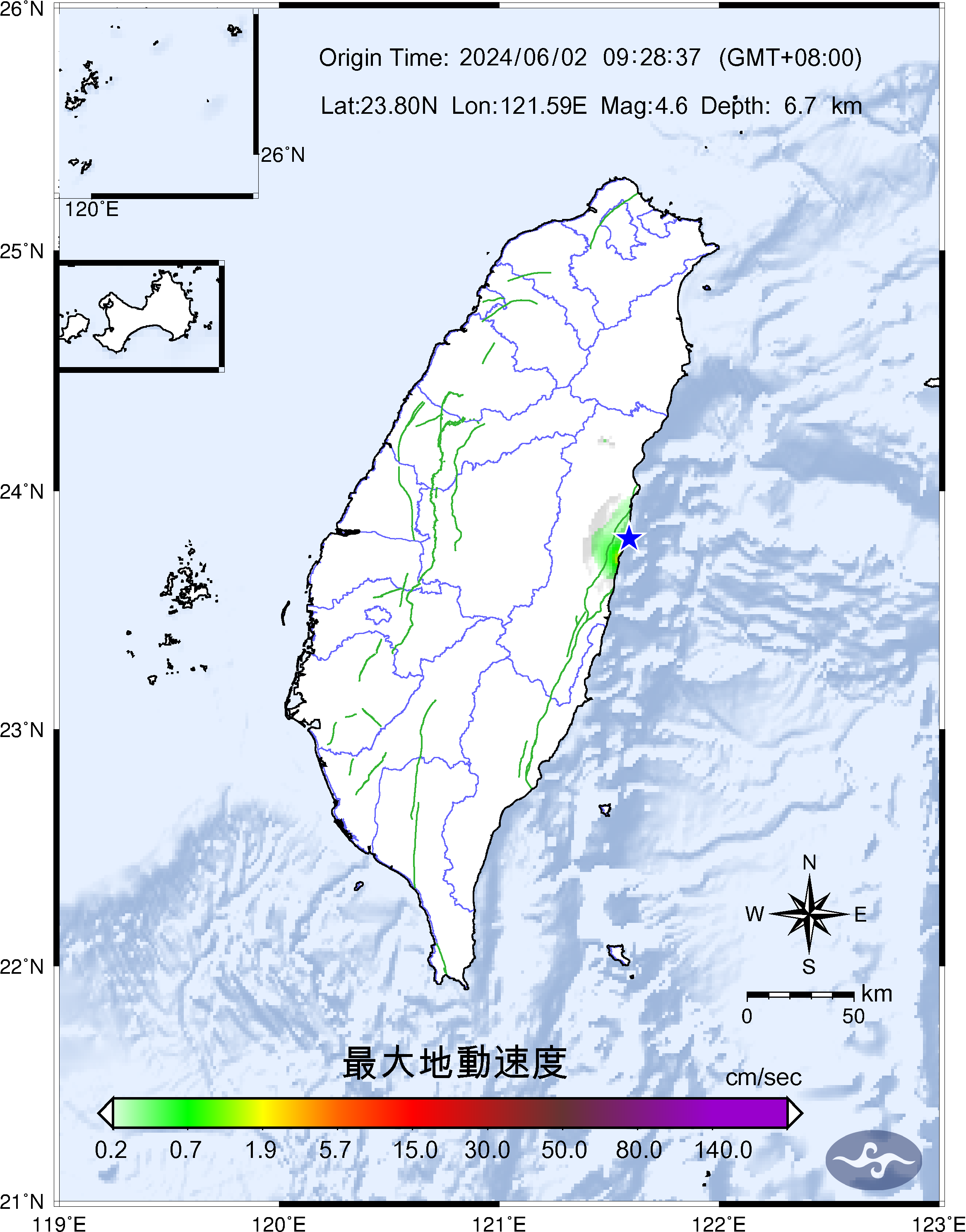 Origin Time:2024/06/02 09:28:37 Lon:121.59°E Lat:23.80°N Depth:6.7km