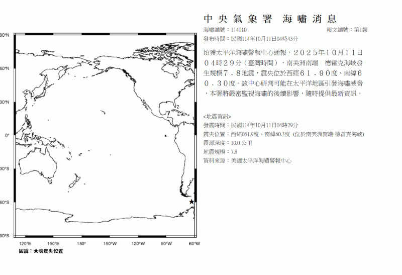 頃獲太平洋海嘯警報中心通報,2025年10月11日04時